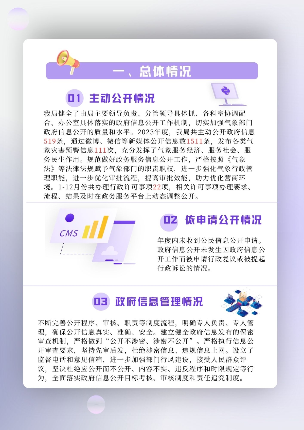 本報告根據《中華人民共和國政府信息公開條例》要求,由桐鄉市氣象局編制。本報告所列數據的統計期限自2023年1月1日起至2023年12月31日止。本報告將在桐鄉市政府信息公開網公布。如對本報告有任何疑問,請與桐鄉市氣象局辦公室聯系(地址:桐鄉市校場東路620號,聯系電話:0573-88106249)。 一、總體情況 (一)主動公開情況。我局健全了由局主要領導負責、分管領導具體抓、各科室協調配合、辦公室具體落實的政府信息公開工作機制,切實加強氣象部門政府信息公開的質量和水平。2023年度,我局共主動公開政府信息519條,通過微博、微信等新媒體公開信息數1511條,發布各類氣象災害預警信息111次,充分發揮了氣象服務經濟、服務社會、服務民生作用。規范做好政務服務信息公開工作,嚴格按照《中華人民共和國氣象法》等法律法規賦予氣象部門的職責職權,進一步強化氣象行政管理職能,進一步優化審批流程,提高審批效能,助力優化營商環境。1-12月份共辦理行政許可事項22項,相關許可事項辦理要求、流程、結果及時在政務服務平臺上動態調整公開。 (二)依申請公開情況。年度內未收到公民信息公開申請。政府信息公開未發生因政府信息公開工作而被申請行政復議或被提起行政訴訟的情況。 (三)政府信息管理情況。不斷完善公開程序、審核、職責等制度流程,明確專人負責、專人管理,確保公開信息真實、準確、安全。建立健全政府信息發布的保密審查機制,嚴格做到“公開不涉密、涉密不公開”。嚴格執行信息公開審查要求,堅持先審后發,杜絕涉密信息、違規信息上網。設立了監督電話和意見信箱,進一步加強部門行風建設,接受人民群眾評議,堅決杜絕應公開而不公開、內容不實、違反程序和時限規定等行為,全面落實政府信息公開目標考核、審核制度和責任追究制度。 (四)平臺建設情況。強化新媒體發布平臺規范建設,拓寬公開渠道。充分利用政府網站、新浪氣象微博、氣象微信公眾號等多個傳播渠道,深入推進天氣預報、預警信息等氣象數據開放共享,打造形式多樣、內容豐富的信息公開平臺。 ???(五)監督保障情況。設立信息公開監督電話,進一步加強部門行風建設,接受人民群眾評議,堅決杜絕應公開而不公開、內容不實、違反程序和時限規定等行為,全面落實政府信息公開目標考核、審核制度和責任追究制度,規范做好政務服務信息公開工作。 二、主動公開政府信息情況
