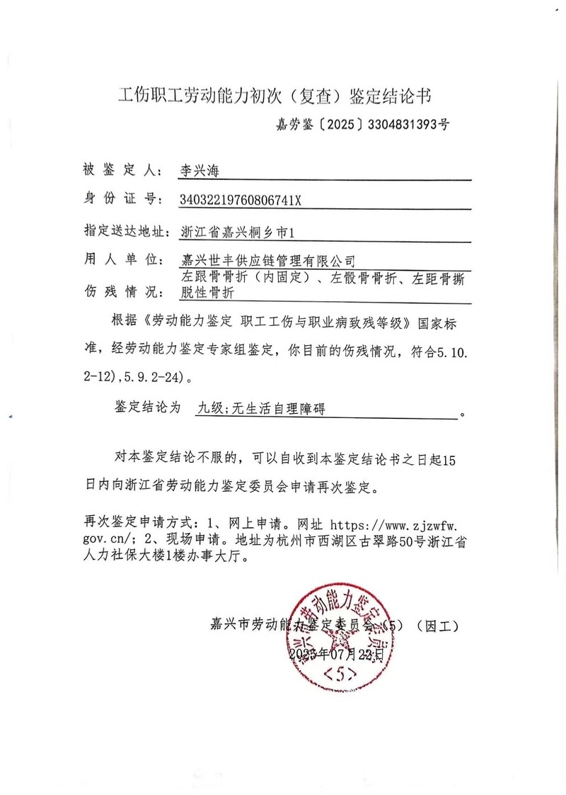 勞動能力鑒定結論書送達公告(申請人:李興海) 嘉興世豐供應鏈管理有限公司: 因采用直接送達、郵寄送達、電子送達等方式無法送達勞動能力初次鑒定結論書(嘉勞鑒[2025]3304831393號),根據《浙江省行政程序辦法》等有關規定,現本機關將勞動能力初次鑒定結論書(嘉勞鑒[2025]3304831393號)以公告形式送達。請你單位自該公告之日起10個工作日內,前來本局勞動能力鑒定中心(地址:桐鄉市梧桐街道康民東路58號2號樓二樓)領取該鑒定結論書紙質文書,逾期視為送達。 聯系人:朱張峰、崔志彪? 聯系電話:0573-88197862? 桐鄉市人力資源和社會保障局 2026年2月10日
