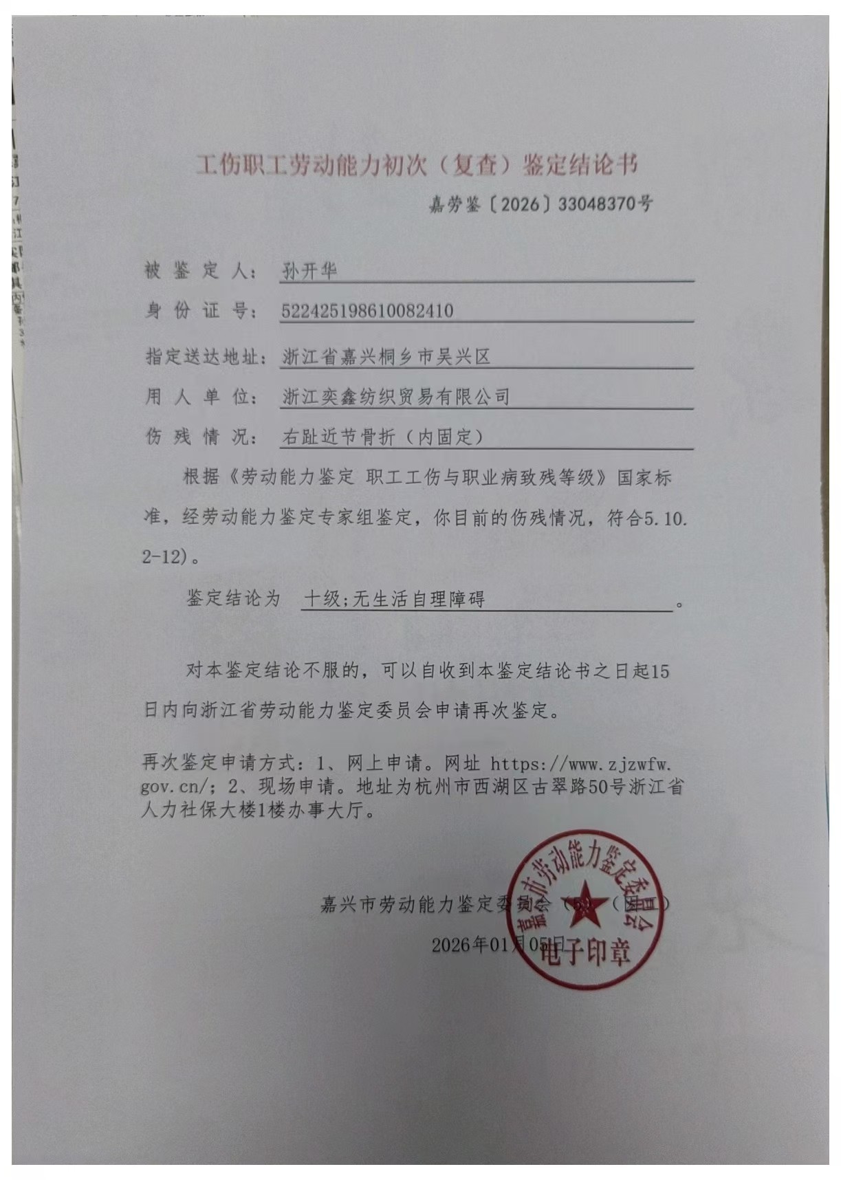 勞動能力鑒定結(jié)論書送達公告(申請人:孫開華) 浙江奕鑫紡織貿(mào)易有限公司: 因采用直接送達、郵寄送達、電子送達等方式無法送達勞動能力初次鑒定結(jié)論書(嘉勞鑒[2026]33048370號),根據(jù)《浙江省行政程序辦法》等有關(guān)規(guī)定,現(xiàn)本機關(guān)將勞動能力初次鑒定結(jié)論書(嘉勞鑒[2025]33048370號)以公告形式送達。請你單位自該公告之日起10個工作日內(nèi),前來本局勞動能力鑒定中心(地址:桐鄉(xiāng)市梧桐街道康民東路58號2號樓二樓)領(lǐng)取該鑒定結(jié)論書紙質(zhì)文書,逾期視為送達。 聯(lián)系人:朱張峰、崔志彪? 聯(lián)系電話:0573-88197862? 桐鄉(xiāng)市人力資源和社會保障局 2026年2月10日 |