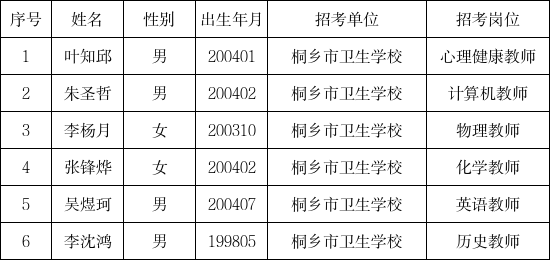 根據《桐鄉市衛生學校面向普通高校應屆畢業生招聘2026學年教師公告》精神,按照“公開、平等、競爭、擇優”原則,經過報名、資格審核、考試、體檢、考察等程序,現將擬聘用人員予以公示。公示對象如有問題,在公示期限內,任何單位和個人均可通過電話、書面或口頭面談的形式向市衛生健康局反映(聯系電話:88621040)。反映時,提倡用真實姓名并告知聯系辦法。