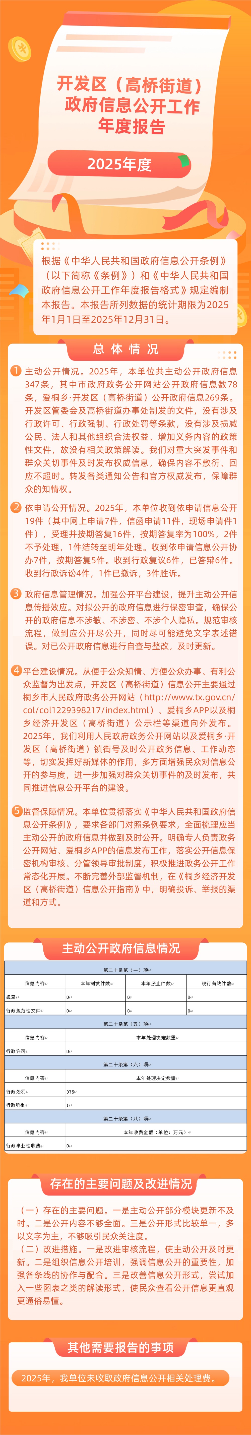 根據《中華人民共和國政府信息公開條例》(以下簡稱《條例》)和《中華人民共和國政府信息公開工作年度報告格式》規定編制本報告。本報告所列數據的統計期限為2025年1月1日至2025年12月31日。 一、總體情況 (一)主動公開情況。2025年,本單位共主動公開政府信息347條,其中市政府政務公開網站公開政府信息數78條,愛桐鄉·開發區(高橋街道)公開政府信息269條。開發區管委會及高橋街道辦事處制發的文件,沒有涉及行政許可、行政強制、行政處罰等條款,沒有涉及損減公民、法人和其他組織合法權益、增加義務內容的政策性文件,故沒有相關政策解讀。 (二)依申請公開情況。2025年,本單位收到依申請信息公開19件(其中網上申請7件,信函申請11件,現場申請件1件),受理并按期答復16件,按期答復率為100%,2件不予處理,1件結轉至明年處理。收到依申請信息公開協辦7件,按期答復5件。收到行政復議6件,已答辯6件。收到行政訴訟4件,1件已撤訴,3件勝訴。 (三)政府信息管理情況。加強公開平臺建設,嚴格執行政府信息公開前保密審查制度,進行“三審三校”后發布。定期對機構信息、政策文件、規劃計劃、報告統計等一系列欄目內容進行更新,將已到期的公開信息及時撤稿,發現錯別字等問題及時整改。 (四)平臺建設情況。從便于公眾知情、方便公眾辦事、有利公眾監督為出發點,開發區(高橋街道)信息公開主要通過桐鄉市人民政府政務公開網站(http://www.shqps.com/col/col1229398217/index.html)、愛桐鄉APP以及桐鄉經濟開發區(高橋街道)公示欄等渠道向外發布。2025年,我們利用人民政府政務公開網站以及愛桐鄉·開發區(高橋街道)鎮街號及時公開政務信息、工作動態等,充分保障群眾知情權、參與權,共同推進信息公開平臺建設。 (五)監督保障情況。本單位貫徹落實《中華人民共和國政府信息公開條例》,全面梳理應當主動公開的政府信息并做到及時公開。明確專人負責政務公開網站、愛桐鄉APP的信息發布工作,落實公開信息保密機構審核、分管領導審批制度,積極推進政務公開工作常態化開展。不斷完善外部監督機制,在《桐鄉經濟開發區(高橋街道)信息公開指南》中,明確投訴、舉報的渠道和方式。 ? ? ? ? ? 二、主動公開政府信息情況